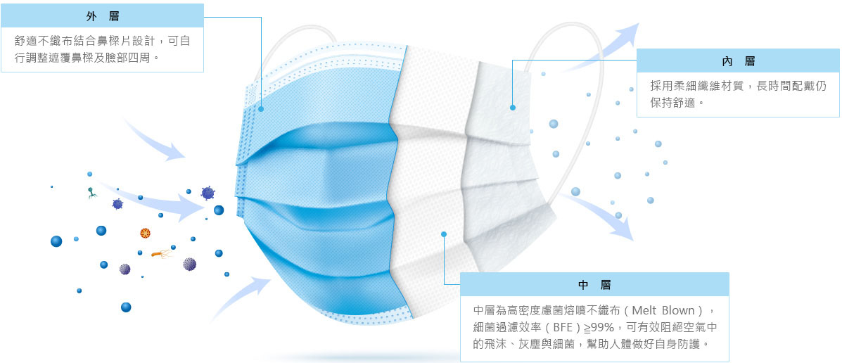 由三層不織布組成,符合CNS14774醫用口罩測試標準,中層為高密度濾菌熔噴不織布(Melt blown),細菌過濾效率(BFE)高,可有效阻隔空氣中的飛沫、灰塵與細菌。